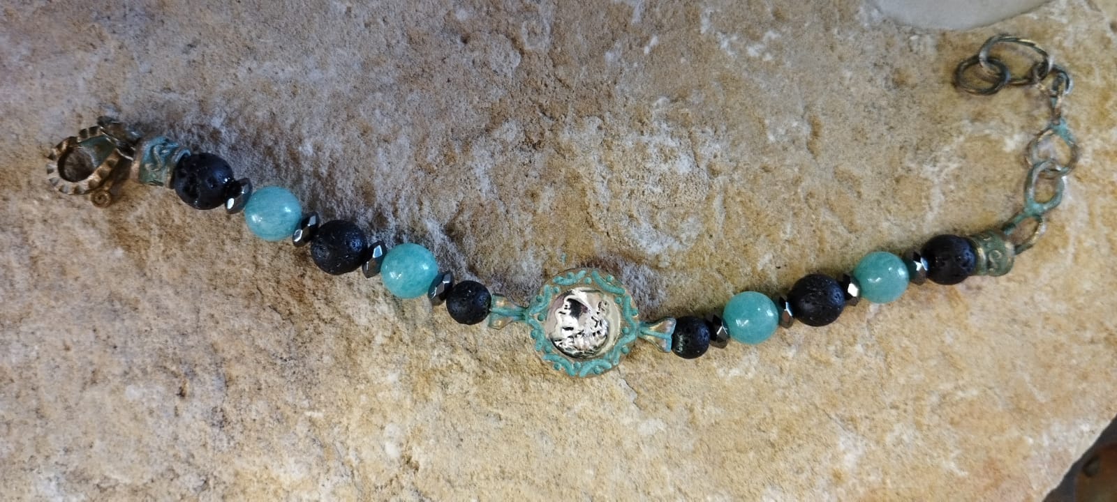 - Materiali pregiati: La combinazione di pietra lavica e amazzonite conferisce forza e delicatezza al bracciale.