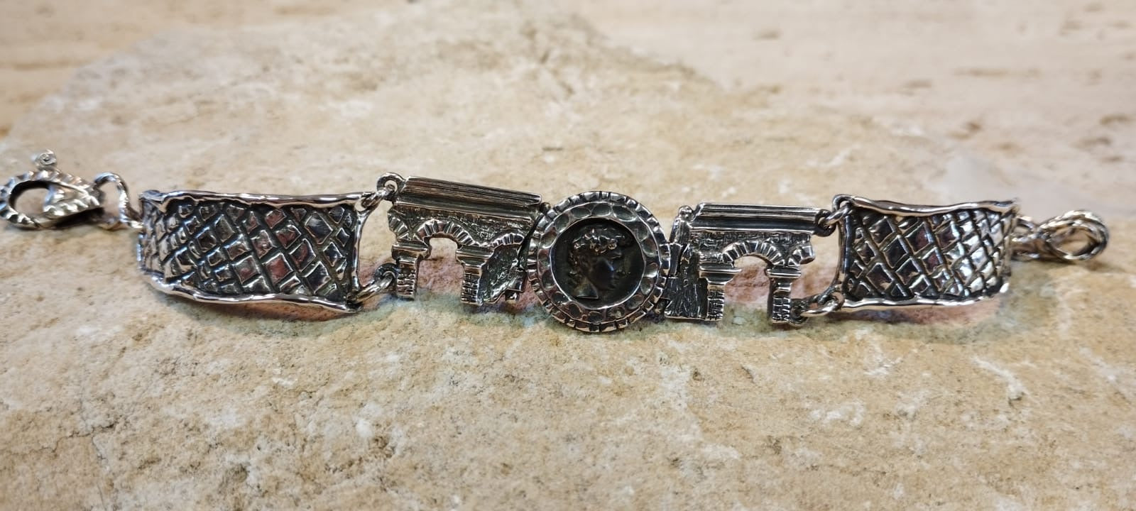 Un bracciale artigianale che celebra la magnificenza dell'antica Roma in una rivisitazione moderna. Realizzato interamente in argento antichizzato, questo gioiello unisex (16/20 cm) è impreziosito da una moneta in bronzo antichata, creando un contrasto unico e ricco di storia.