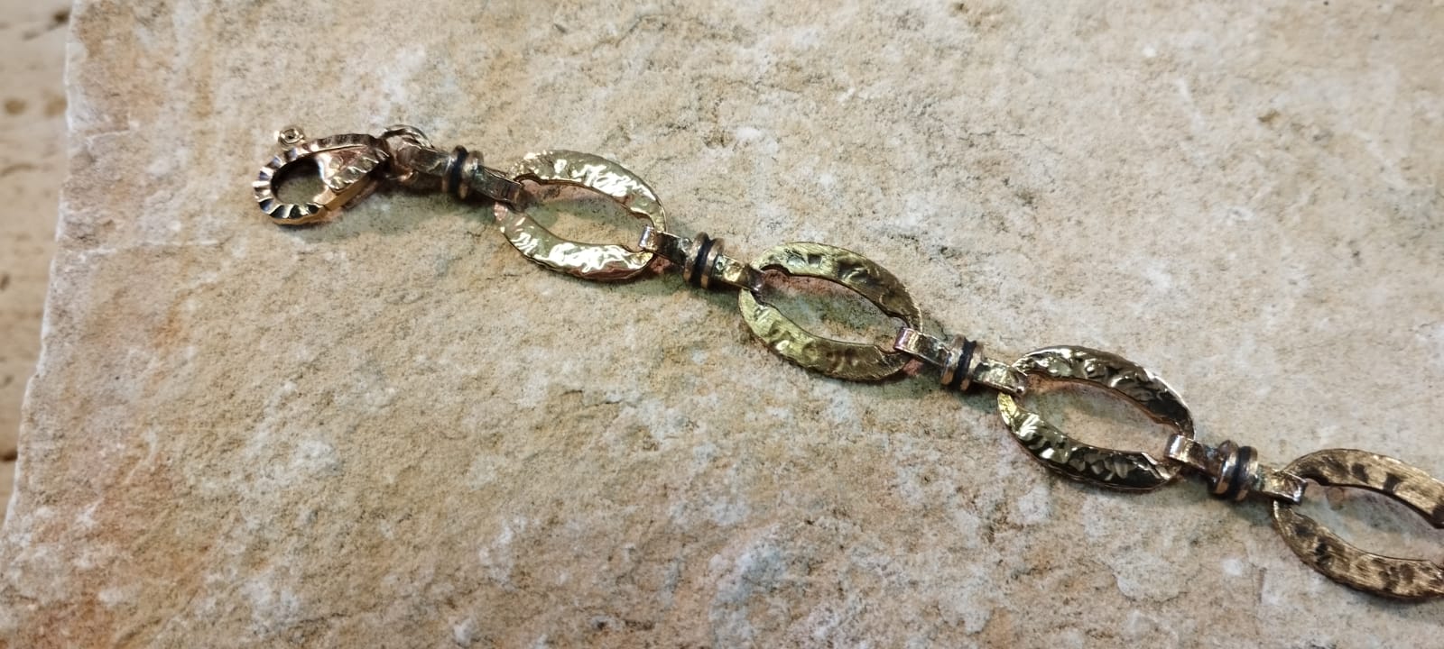Un bracciale artigianale che unisce la forza del bronzo e la raffinatezza dei spinelli neri, per un accessorio dal fascino storico e dall’anima contemporanea. La catena martellata in stile romano, rifinita con una texture ossidata, conferisce un carattere deciso e un tocco di autenticità.