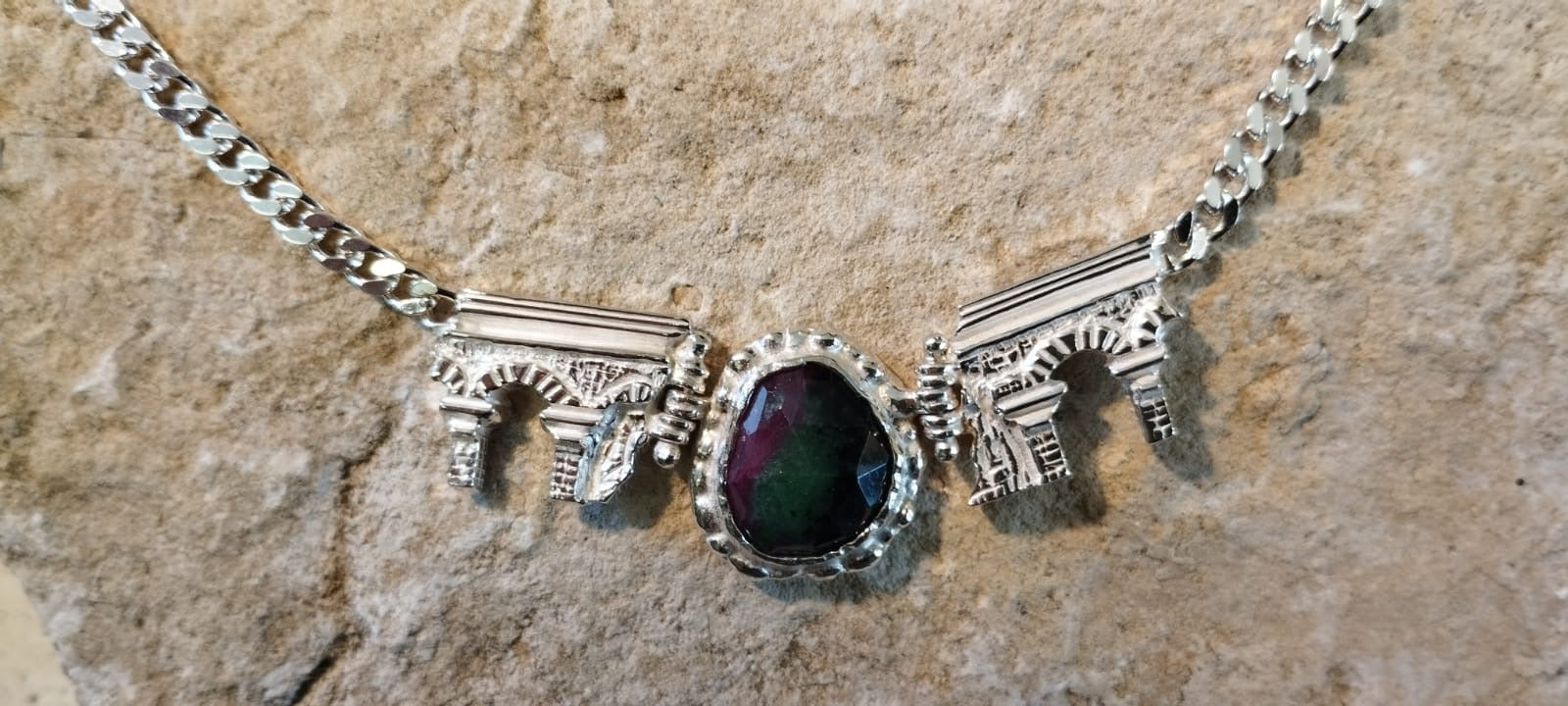 Un omaggio alla grandiosità dell’antica Roma e alla raffinatezza dell’arte etrusca. Questa collana in argento 925 mette in risalto una magnifica pietra di radice di rubino, incastonata tra due riproduzioni di acquedotti romani, simboli di ingegno e potere.
